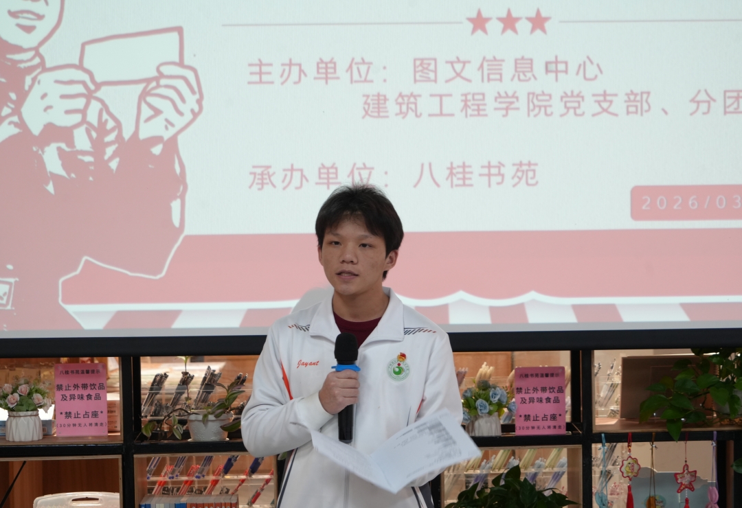 为深入弘扬雷锋精神,引导团学骨干坚定理想信念、勇担时代使命,3月29日下午,建筑工程学院在八桂书苑举办“小红砖铸魂传薪火·雷锋精神润青春”读书分享会,建筑工程学院专职组织员梁晓蓝、分团委书记黄颖以及团学骨干参与活动。