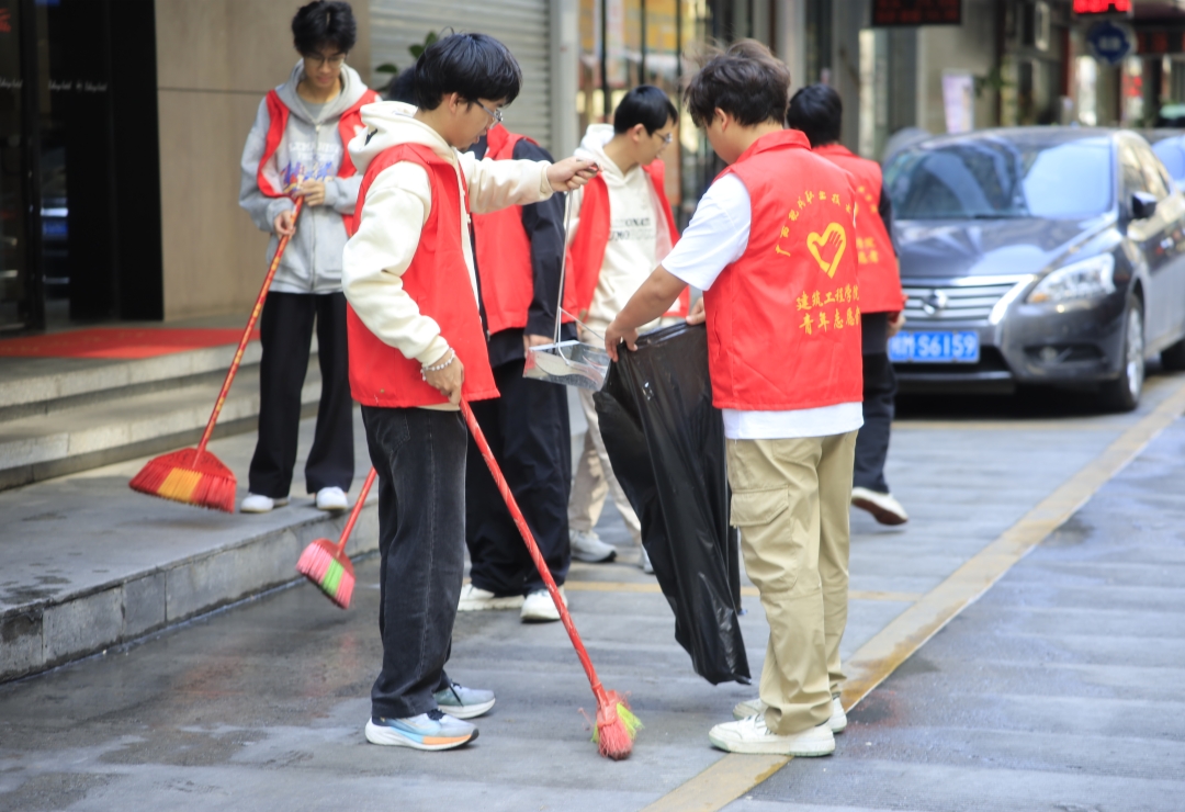 仪式结束后,建筑工程学院组织20名师生代表奔赴南桥河岸延道、河池市体育馆后方夜宵摊区域开展志愿服务。在建筑工程学院“小红砖” 党员先锋的带头示范下,师生们分工协作,仔细清理河岸周边白色垃圾、生活垃圾,将捡拾的垃圾归堆后统一规范处置,有效改善河岸生态环境;在夜宵摊区域,大家重点清理油污、顽固污渍,同步清除周边杂草杂物,全力整治环境卫生死角,以实干擦亮城市“颜值”。