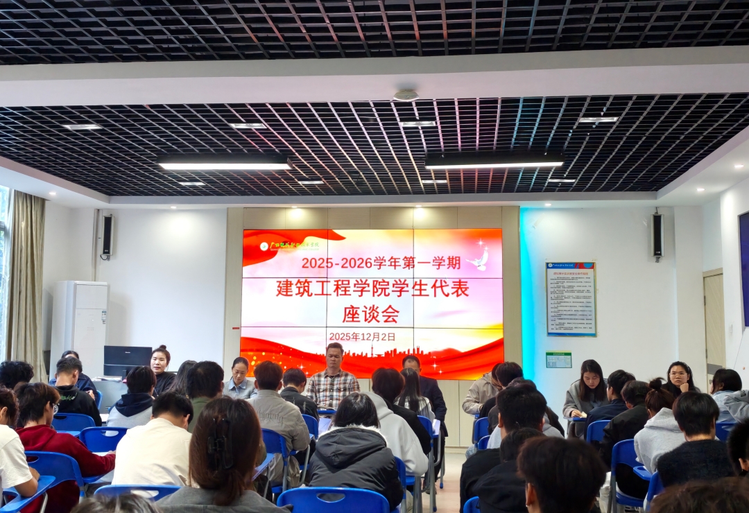 12月2日下午,建筑工程学院在第一实训楼202教室召开2025—2026学年第一学期教学工作学生代表座谈会。会议主要目的是加强沟通,增进了解,广泛听取学生对我院课堂教学、实习实训及教学管理工作的意见,进一步提高教学质量和管理水平。本次会议由苏文良副院长主持,参加会议的有建筑工程学院罗皓副书记、学校质量管理办公室韦薇老师、建筑工程学院各专业负责人、教师代表、年级辅导员、学院教学秘书和学院2024级、2025级各班级学生代表。