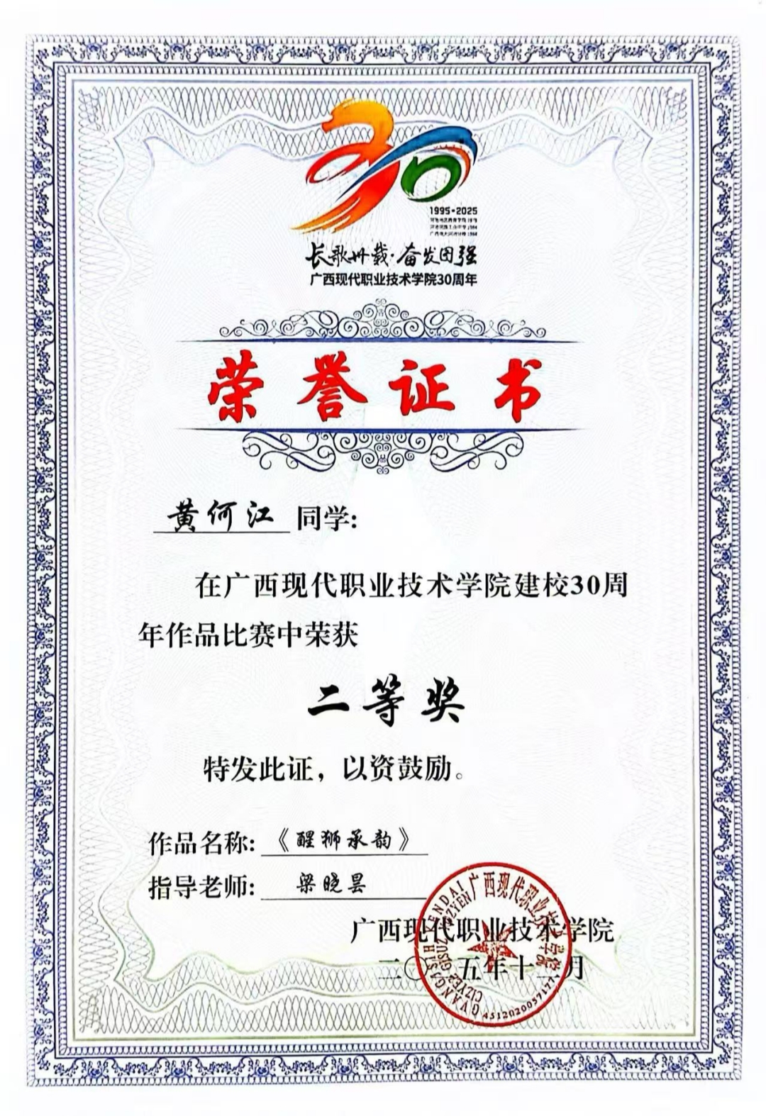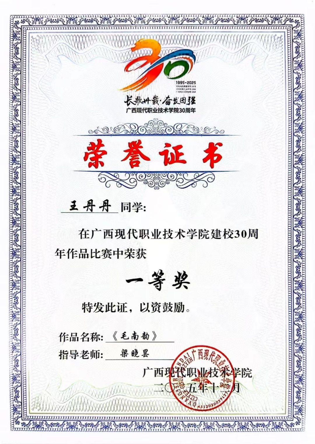 与此同时,学院在文化艺术创作领域同样捷报频传。在校庆主题作品比赛中,学院选送的学生作品题材新颖、制作精良,成绩斐然。其中,23广告1班王丹丹的作品《毛南韵》(指导老师:梁晓昙)、同班蓝红素的作品《卅载芳章》(指导老师:林珍全)双双荣获一等奖;25广告1班黄何江的作品《醒狮承韵》(指导老师:梁晓昙)获得二等奖。这些作品深度融合民族元素与时代创意,生动展现了学院学子扎实的专业技能、丰富的文化素养和积极的创新精神。