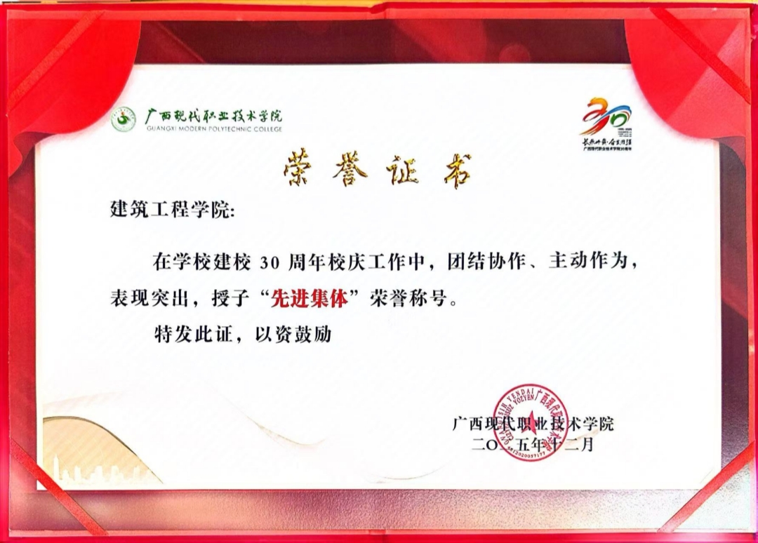 在学校30周年校庆工作系列活动中,建筑工程学院凭借其出色的组织协调能力与积极的创新实践,荣获“先进集体”荣誉称号,并在同期举办的建校30周年作品比赛中斩获“优秀组织奖”,展现出学院强大的凝聚力与丰硕的育人成果。
